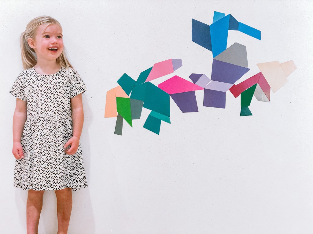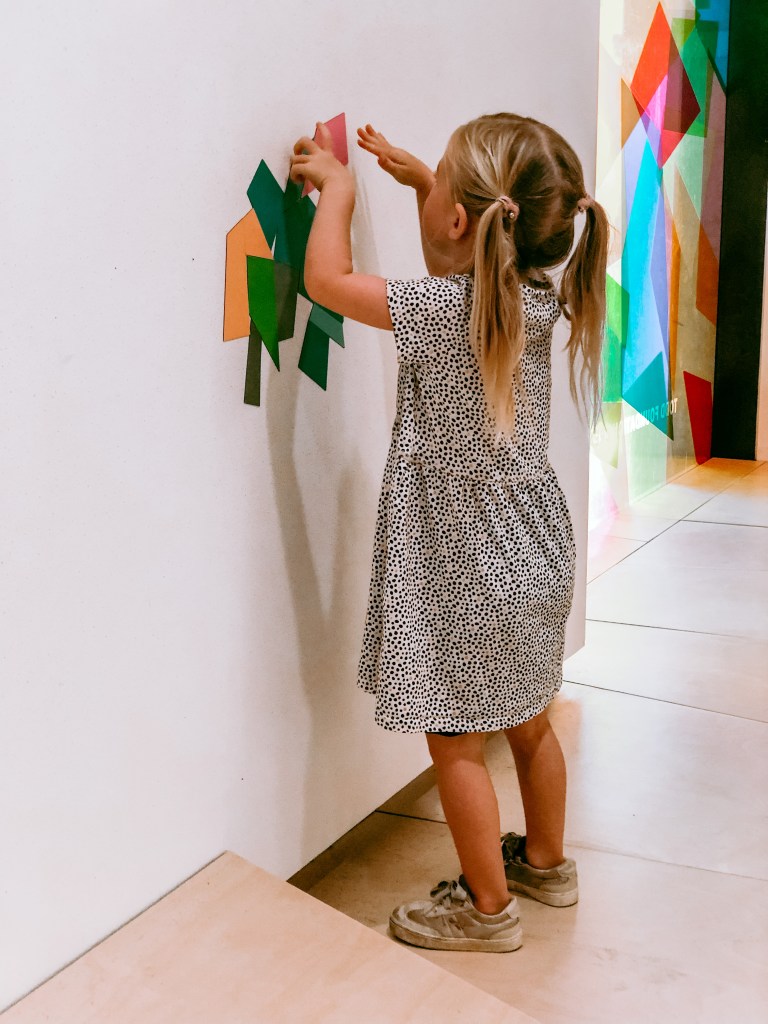 I took Amelie along to the Auckland Art Gallery one weekend recently. We used to go together all the time when we lived in the city, and I’ve really been missing it! There was an installation in the Creative Learning Centre – All My Favourite Shapes, by Sara Hughes – that was just fantastic. We could have spent all day there. They’ve painted the walls with magnetic paint and then there are thousands of different magnetic shapes, in all different colours, that you can create your own artwork out of. Amelie and I had fun creating some pictures together, but it was also intensely relaxing for me – Amelie was quite happy to work away at it on her own. It honestly made me wonder about creating it on a small scale in her bedroom at home. It was very hard to get her out of there, but other than that, it was a fun, relaxing, chilled activity for the two of us in a beautiful space.