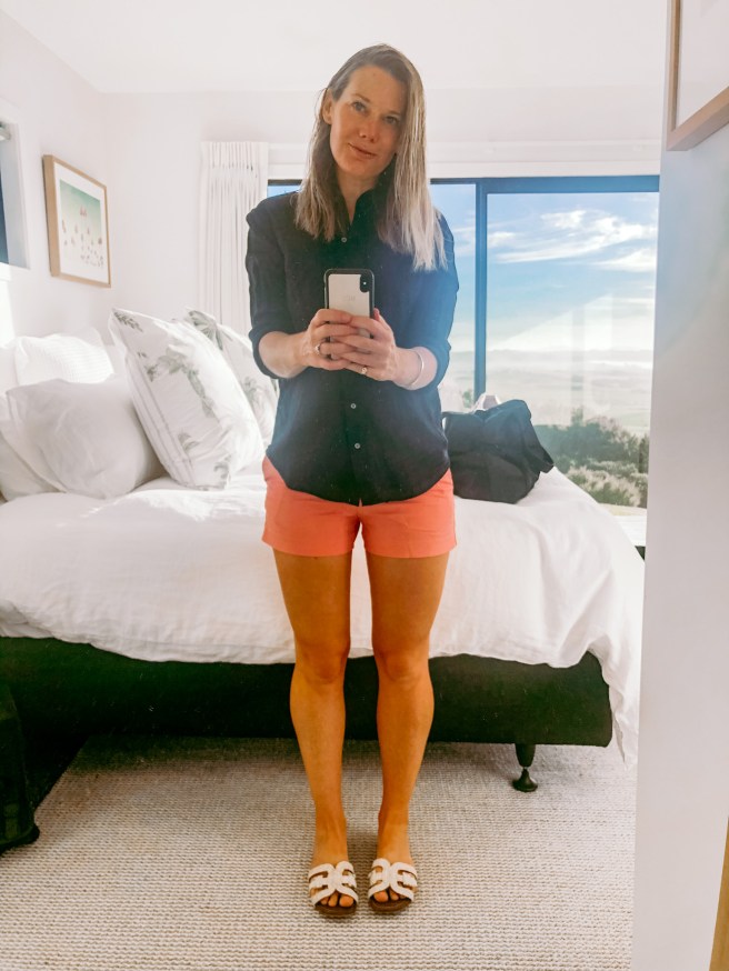 This photo is from late 2020, but the shorts are at least five years old. I have the same pair in navy. When they are no longer wearable I’ll look to buy pretty much exactly the same thing again, just as I did with their predecessors. These ones are from Gap, but the ones I owned before these were from J.Crew. The shirt is linen, from Country Road. I love wearing shirts with shorts, not least because they make great cover-ups for the beach to keep the sun off my shoulders.