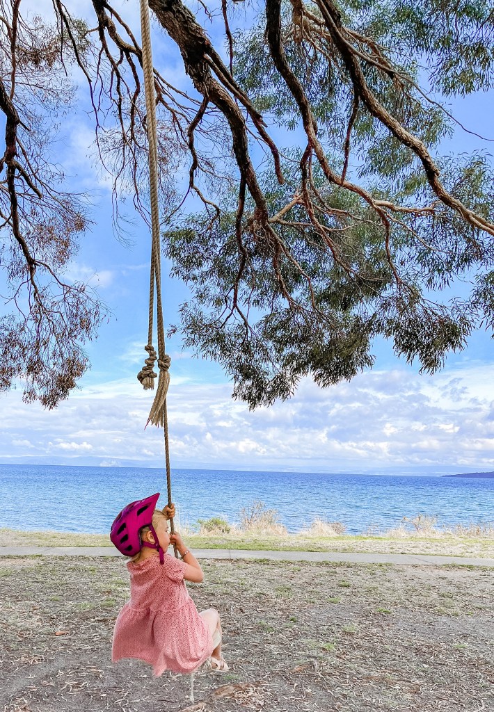Swinging with a view! As you can probably tell from the helmet, Amelie abandoned her bike the minute she saw the rope swing. This is along the waterfront path, around Five Mile Bay – this path is an absolute winner for running and cycling.