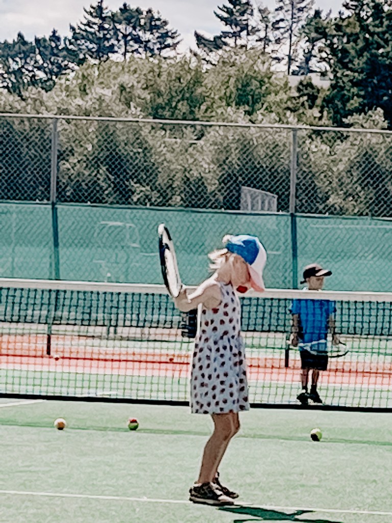 Amelie started junior coaching at our tennis club this term and she is having the best time! She’s doing an amazing job of paying attention, listening, and doing what the coach tells her, and it’s paying off – in just a few weeks she’s really started to get it. I love watching the lessons and think I could possibly benefit from taking them as well – I’ve had many lessons over the years but nobody has ever told me to stand like a scarecrow or use my racket handle as a laser. It makes sense!