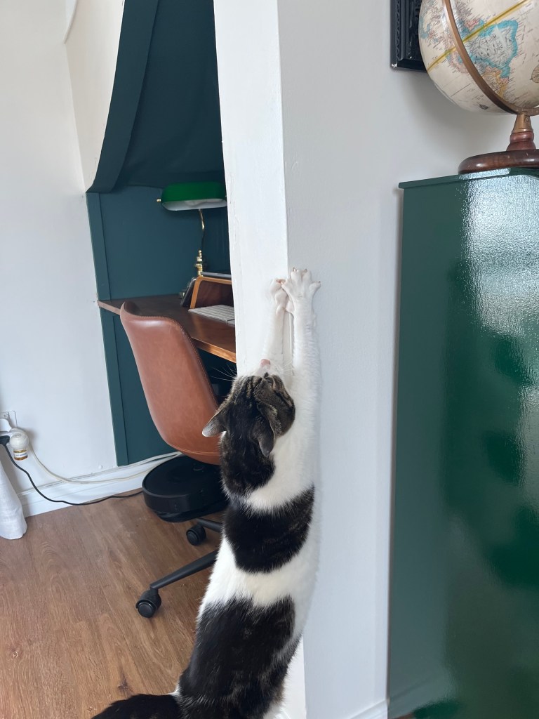 Speaking of renovations…it’s really time for another update post! Until that comes though, accept this sneak peek of our new desk area (it’s not quite complete, but close!) and a sneaky photo crasher. Although, that said, Amelie took this photo and I’m pretty sure she was more interested in the cat than anything else…but the background makes for a good sneak peek, in my opinion!