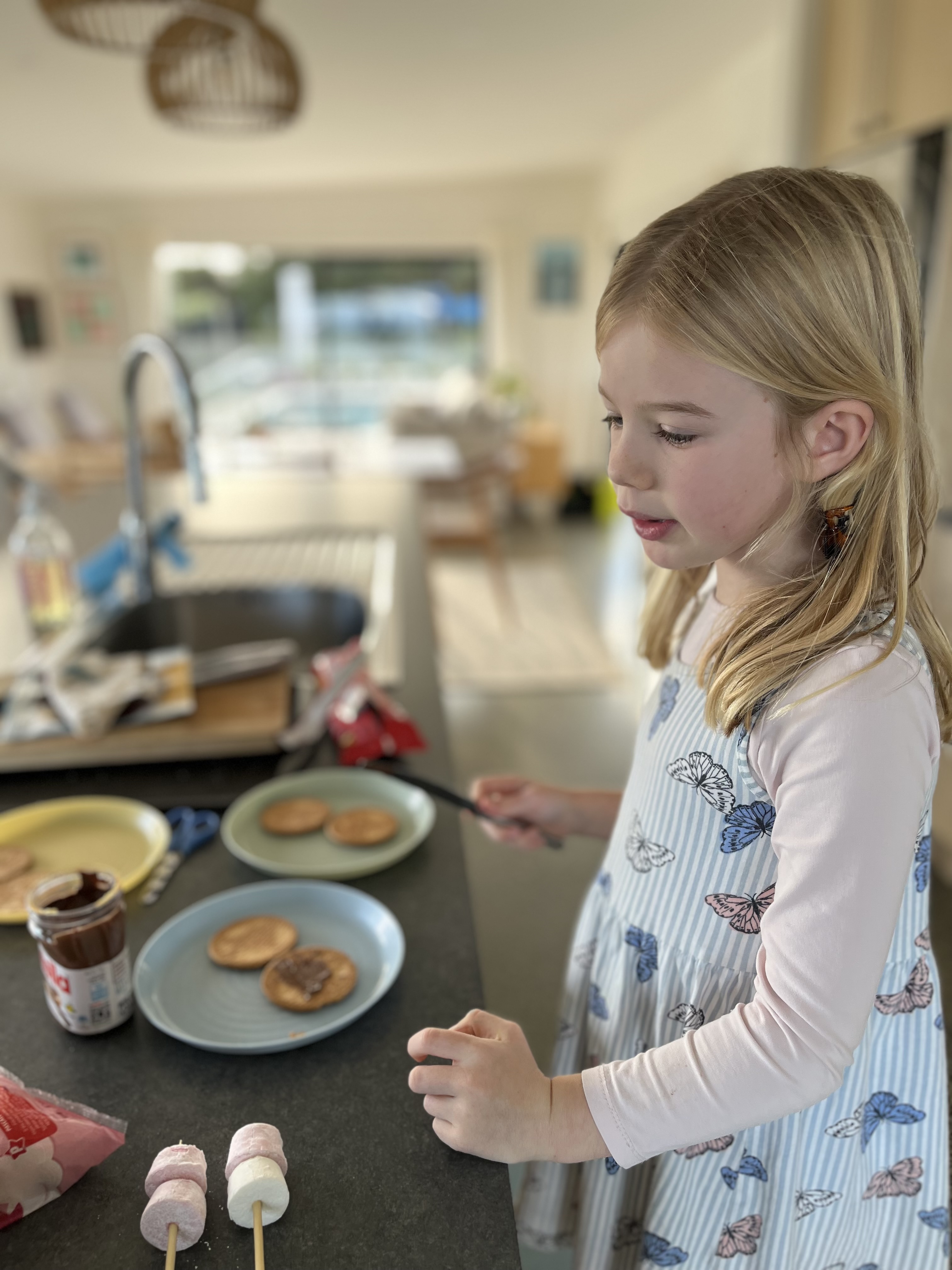 The ‘recipe’ for these s’mores, using Nutella, was in Amelie’s Barbie magazine and she pestered us for weeks about making them. We staved her off by agreeing that we’d make them next time we were in the country, and then we did just that the first time we returned for the weekend after we’d moved back down! They were delicious, I must say. And how delightful are s’mores on a sunny autumn day?!